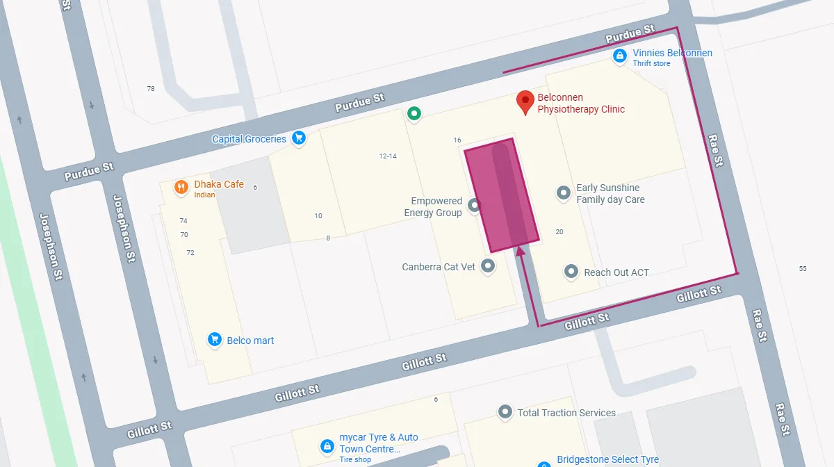 Free parking is available directly outside our clinic on Gillot Street, making your visit to Belconnen Physiotherapy Clinic easy and convenient.